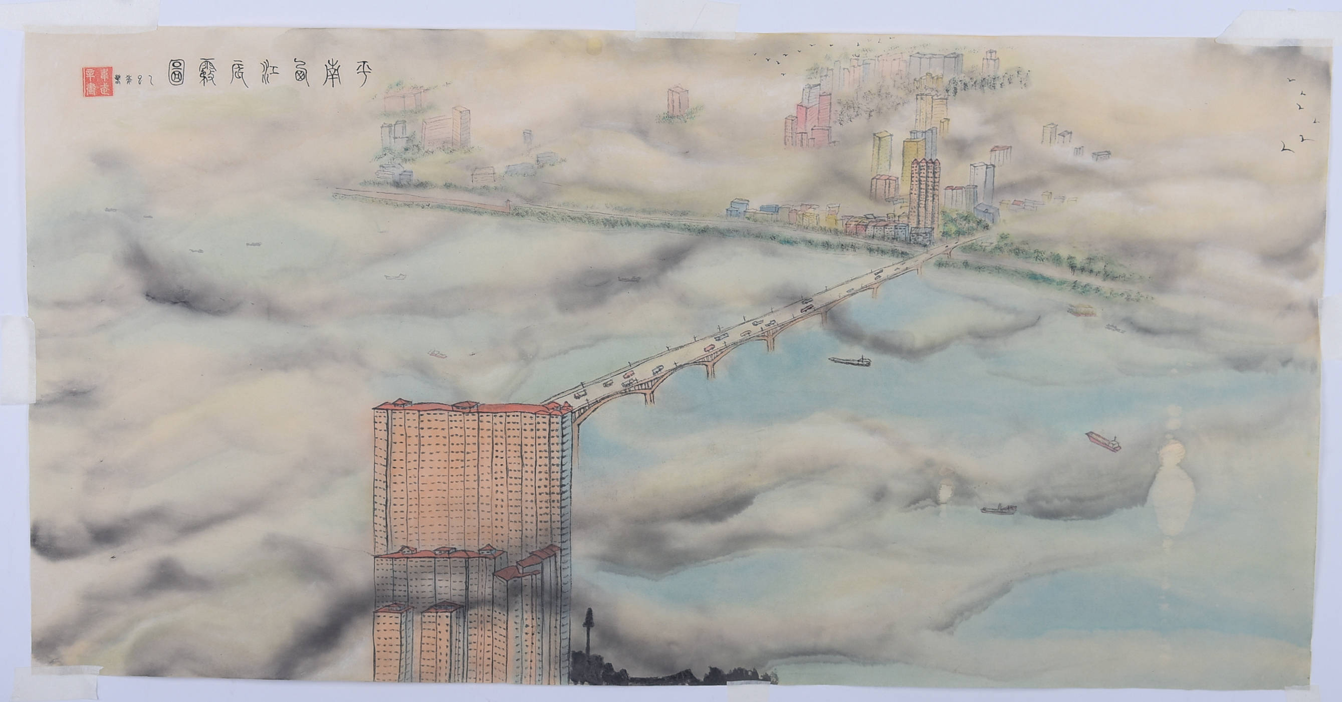 画面简介:《平南西江晨雾图》桥栏金属结构以钛白混合朱磦呈现暖调钢骨,既突破传统界画金碧设色程式,又规避西画透视对水墨气韵的消解——晨雾中渐隐的桥墩与丹霞地貌肌理通过同色系赭石过渡,实现现代工程与喀斯特地貌的视觉共生。江面蒸腾的水汽与汽车尾气在生宣上自然晕染,形成独具工业美学特征的"水墨碳足迹”既要绿色青山又要金山银山。画面采用s型构图特点,色彩主要用:硃磦和三青为主,三绿辅!