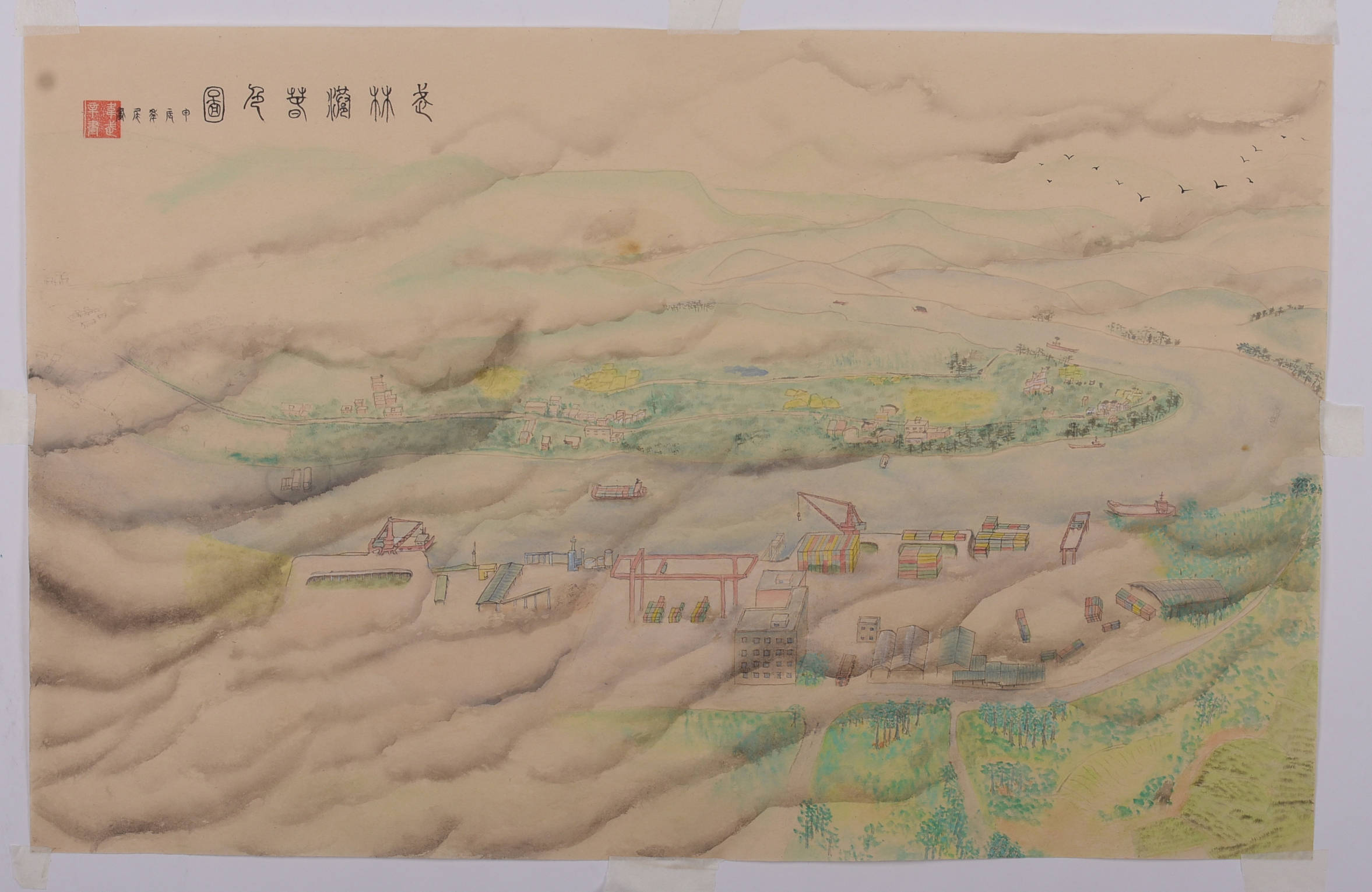 创作理念:《武林港春色图》早晨武林港繁华,朝阳的景像,货运船在西江江面通过,远处的乡村现代的楼房到处可见!起重机伸展的钢铁臂膀在雾中幻化成仙鹤展翅,货船鸣笛声与山中晨钟在氤氲水气中交织,构筑出连接仙凡的魔幻晨曦。主要颜色:黄绿和三青为主,硃磦为辅。