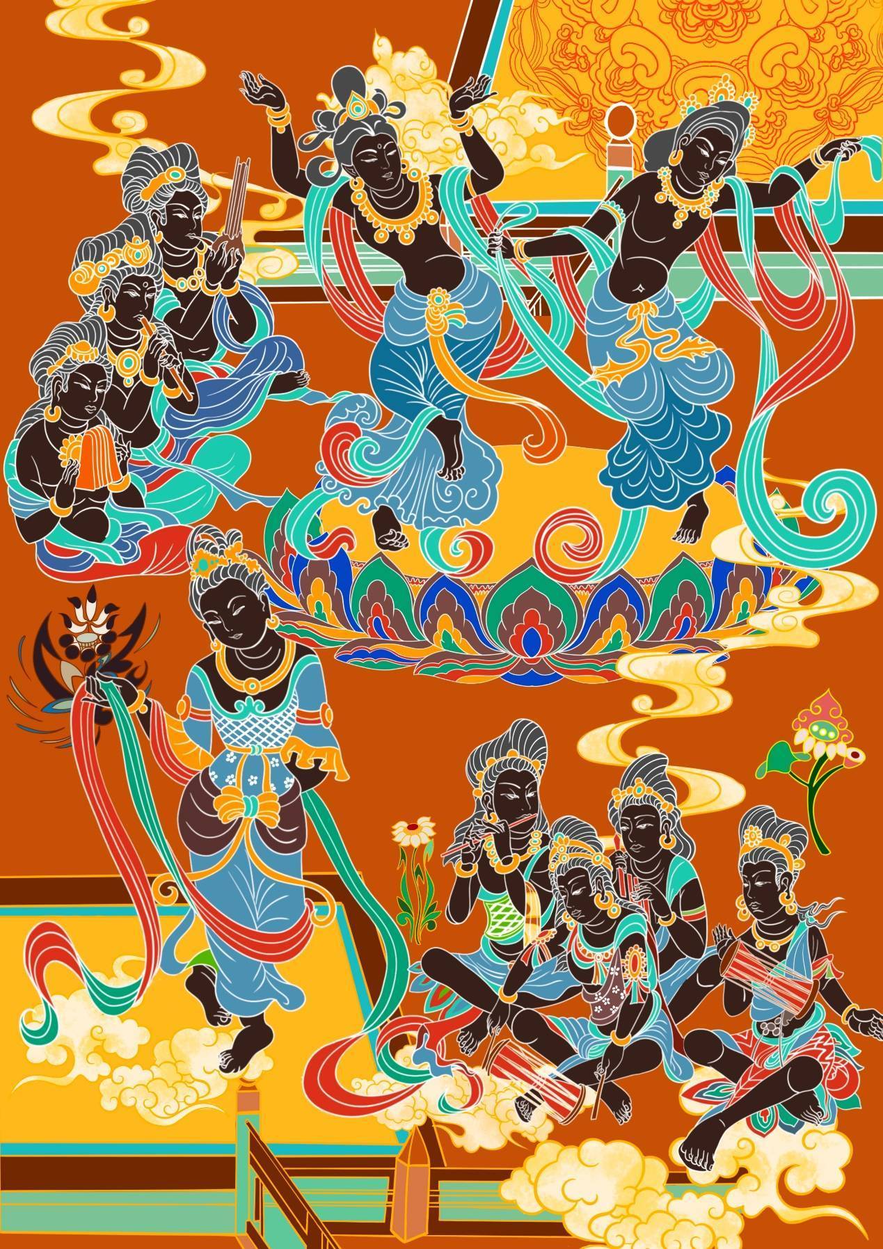 创作理念:敦煌壁画中的乐舞题材极为丰富,从飞天奏乐到俗世歌舞,从宫廷乐舞到民间百戏,应有尽有。这些壁画生动地记录了古代乐舞艺术的盛况,展现了音乐与舞蹈的完美结合。壁画中的乐器种类繁多,从琵琶、箜篌到横笛、排箫,从羯鼓、腰鼓到方响、铙钹,几乎涵盖了古代所有重要乐器。黄冬玲笔下的《敦煌舞乐》通过巧妙构图,展现出音乐的美妙韵律,舞者的姿态更是千变万化,或轻盈飘逸,或刚劲有力,将舞蹈的动态美表现得淋漓尽致,让观者仿佛能够听到悠扬的乐声,看到灵动的舞姿。笔下的她们怡然自得,眉目间笑意含蓄,举手投足间优雅自信,丰富的色彩变化和流畅柔美的线条,画面充满古典音乐的韵律感,让人未闻其声,便会其意,沉浸其中。