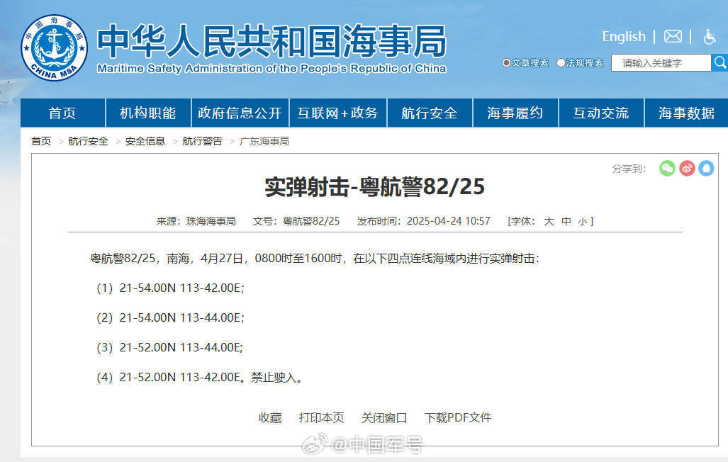 据中国海事局网站消息,珠海海事局发布航行警告,4月27日8时至16时,南海部分海域进行实弹射击,禁止驶入。(中国海事局网站)