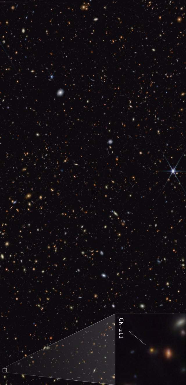 来认识一下 GNZ11,这是一个极其遥远的星系,我们看到的是它在大爆炸后仅 4 亿年时的样子,那时宇宙的年龄只有现在的 3% ,GNZ11 的红移为 11.1,这意味着来自这个星系的光的波长由于宇宙膨胀被拉伸了 12.1 倍。