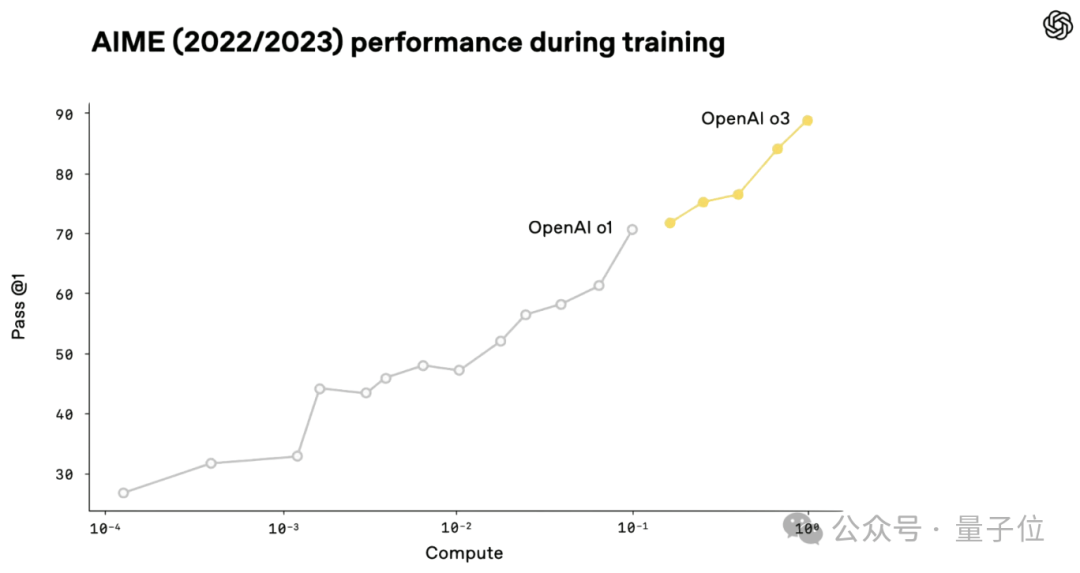 首先, OpenAI公开过这样一张图表,上面展示了o3和o1在AIME基准测试中的表现,以及两者在推理训练阶段可能所需的算力的对比——