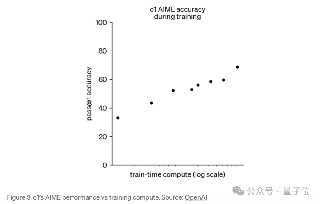 就像OpenAI展示出的下图,以及DeepSeek-R1论文中的图2一样——模型答题准确率随着推理训练步骤的增加而大致呈对数线性增长。