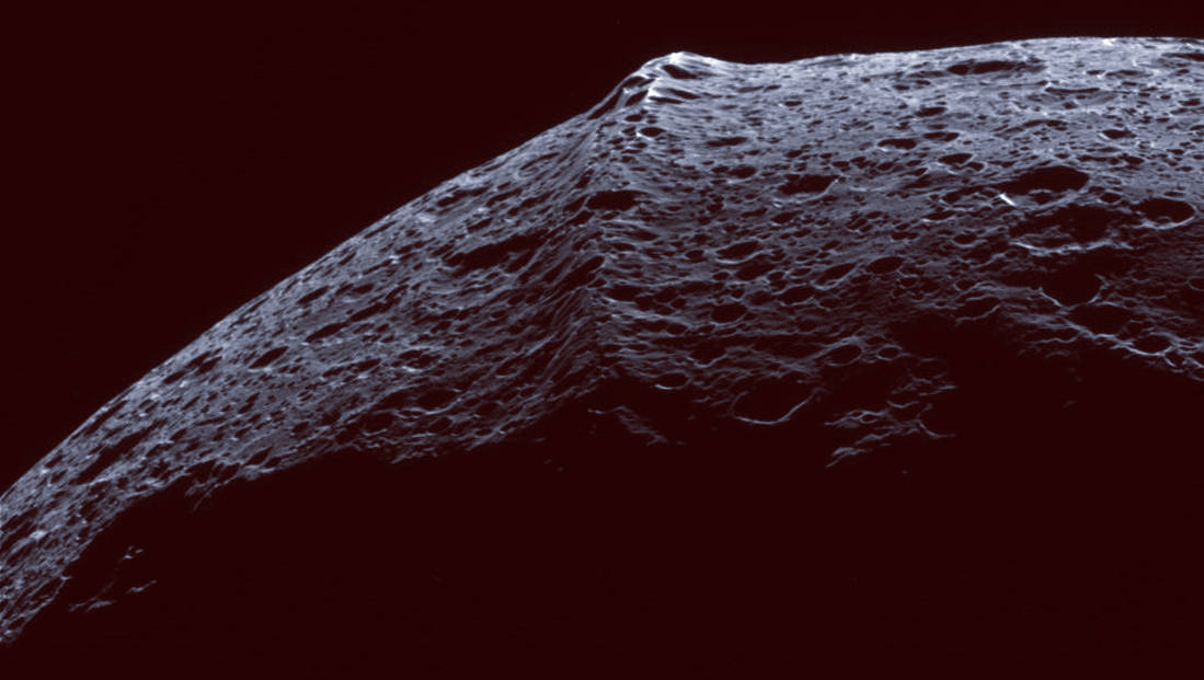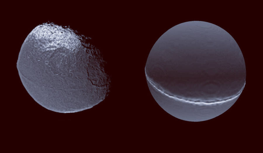 但这还没有完,在2004年的时候,一个名为“卡西尼号”的探测器近距离“拜访”了土卫八,其传回的图像显示,在这颗星球的赤道区域,存在着一条规模巨大的隆起带,其平均宽度约为20公里,高度可达13公里,它沿着土卫八的赤道,延伸了大约1300公里。