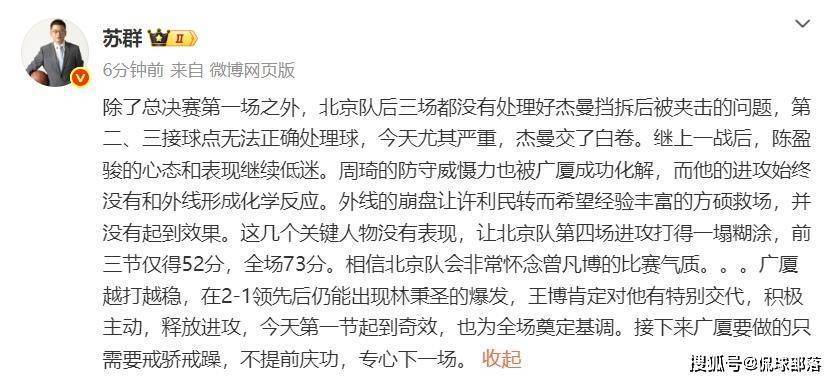 赛后第一时间,国内篮球名嘴苏群进行了点评,认为北京队输球的关键,第一点是最近三场都没有处理好杰曼挡拆后被夹击的问题,第二点是外线的崩盘让许利民转而希望经验丰富的方硕救场,并没有起到效果。此外,苏群还表示林秉圣的爆发,对于广厦队的帮助很大。
