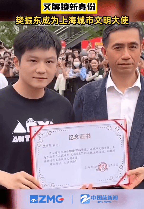 5月15日,据@中国蓝新闻 消息,樊振东参加上海精神文明宣传活动,活动现场,樊振东担任 2025-2026年度上海城市文明大使,并获颁纪念证书。