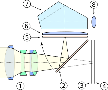 在摄影领域中还有就一个巧妙利用反射镜的摄影设备——单反相机(单镜头反光相机)。其独特之处在于其取景器的设计。其镜头兼作取景物镜,在摄影镜头与数码相机的感光元件之间,有一反光镜与光学主轴成 45° 角。影像通过反光镜,从而显示在机身上方的调焦屏上,通过取景目镜和五棱镜,拍摄者可以观察取景对象,因而取景无视差,且较明亮。拍摄时,反光镜抬起(下图中的②),光线才能到达感光元件。