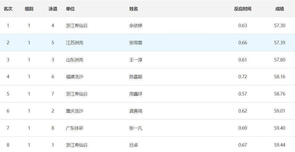 半决赛余依婷游出了57秒57的成绩,力压张雨霏排名第1位,张雨霏游出了57秒94的成绩。