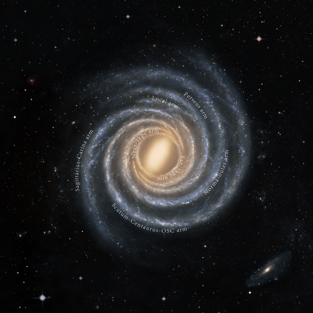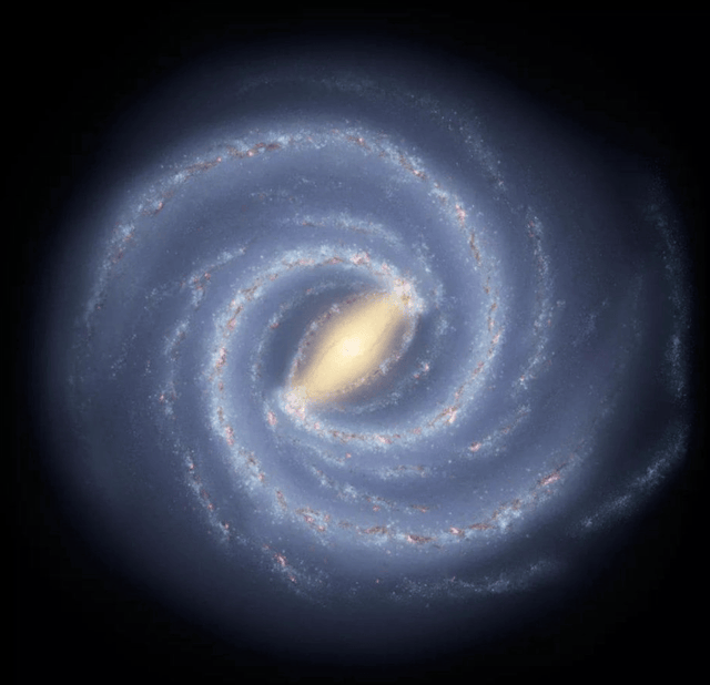 银河系的鸟瞰图,常见于教科书和科普节目,展现银河四条主要旋臂(英仙臂、猎户臂等)和中央棒状结构,但这不是飞船从银河外拍摄的照片,而是科学推测和艺术渲染的结合。