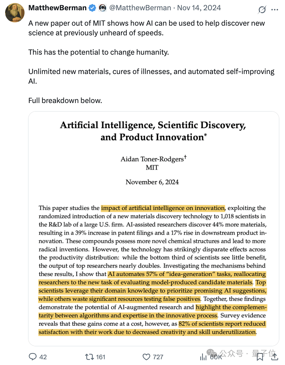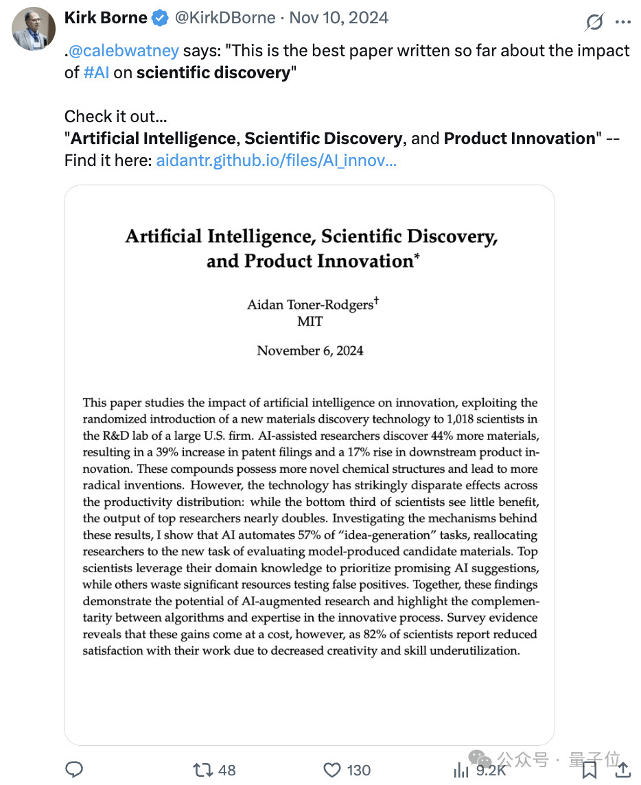 还有人将其称作是「迄今为止关于AI对科学发现影响的最佳论文」。