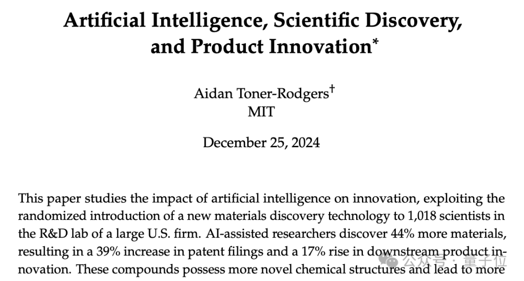 论文题为“Artificial Intelligence, Scientific Discovery, and Product Innovation”,作者只有Aidan Toner-Rodgers一个人,论文发布时是MIT经济系博士生。