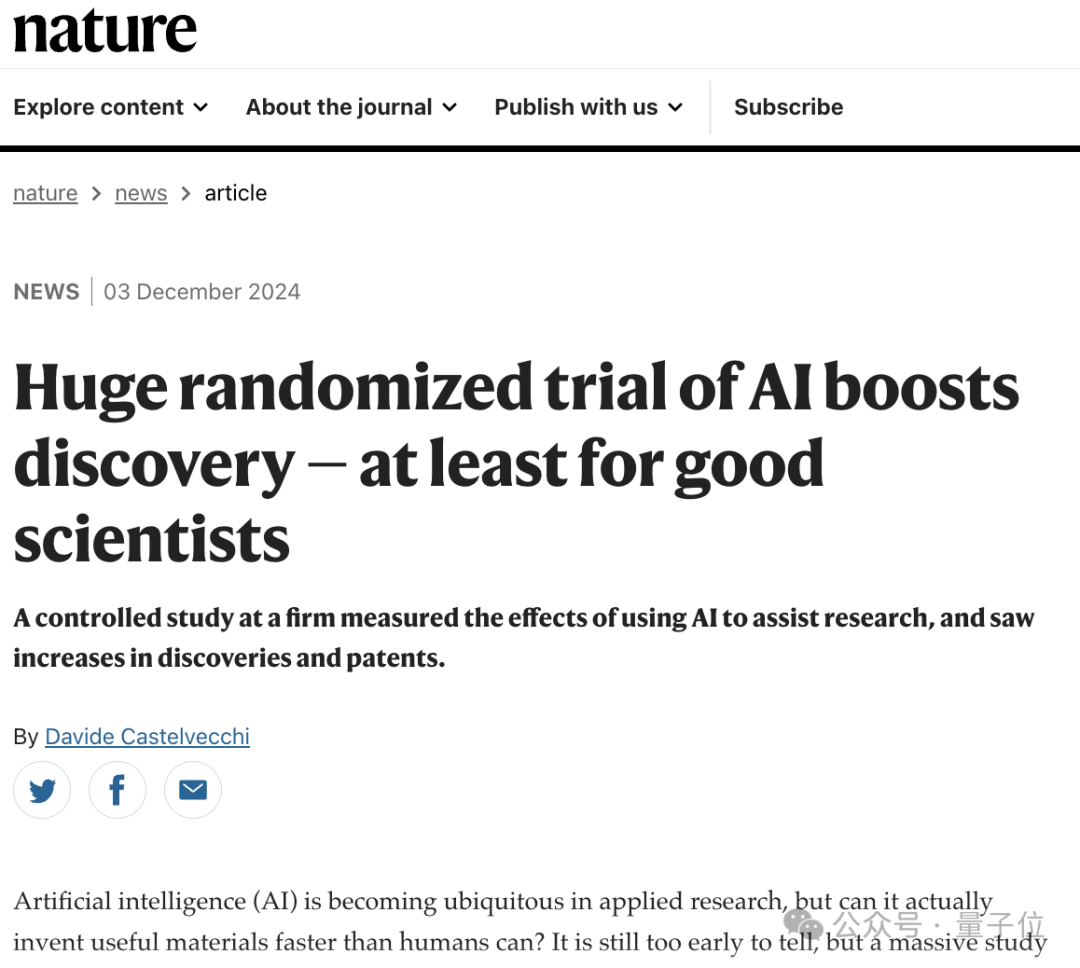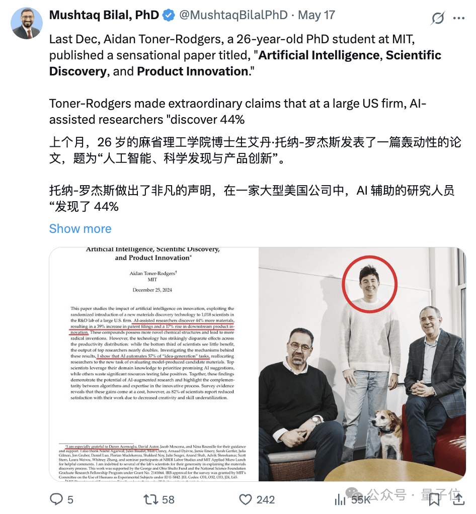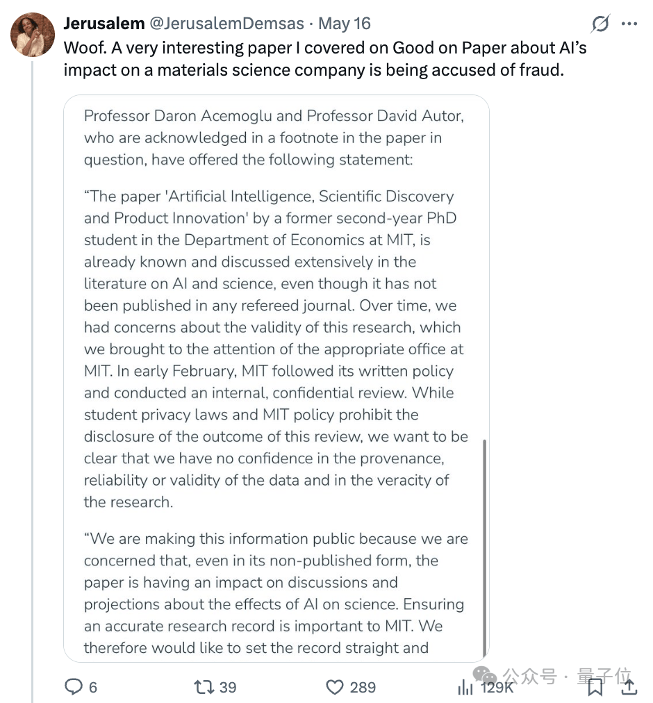 「AI对科学发现影响的最佳论文」被曝造假,MIT发声明与其划清界限!