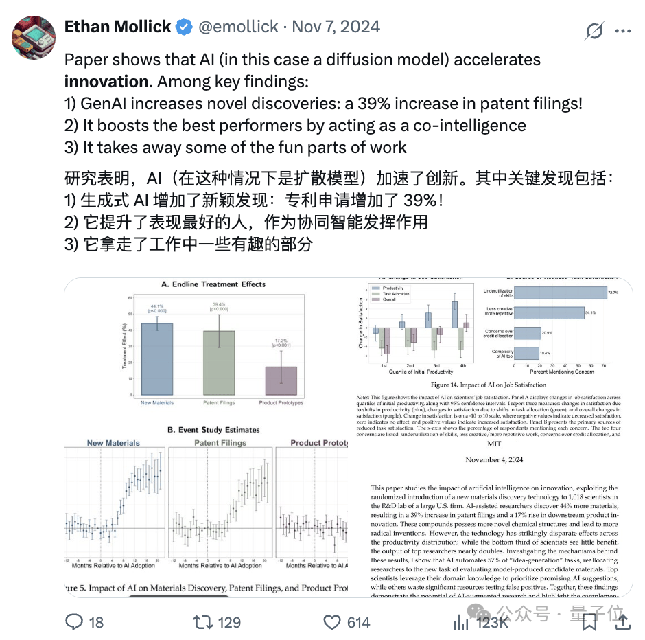使用AI辅助的研究人员新材料发现量增加了44%,专利申请量增长39%,下游产品创新提升17%。