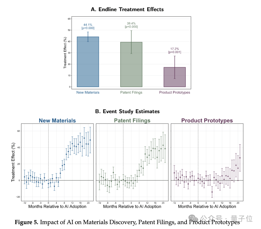 它表明,研究人员使用AI辅助后,新材料发现量增加44%、专利申请量增加39%、下游产品创新提升17%。