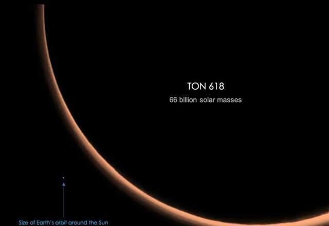 但即使是像盾牌座uy这样的恒星,与宇宙中真正的“庞然大物”相比也显得渺小,这是Ton 618,我们已知最大的黑洞之一,其内部可以容纳32个太阳系,不是地球,不是木星,而是整个太阳系,这个黑洞的质量是太阳的660亿倍,相比之下,银河系中心的超级黑洞,质量只有太阳的440万倍,差了好几个数量级。