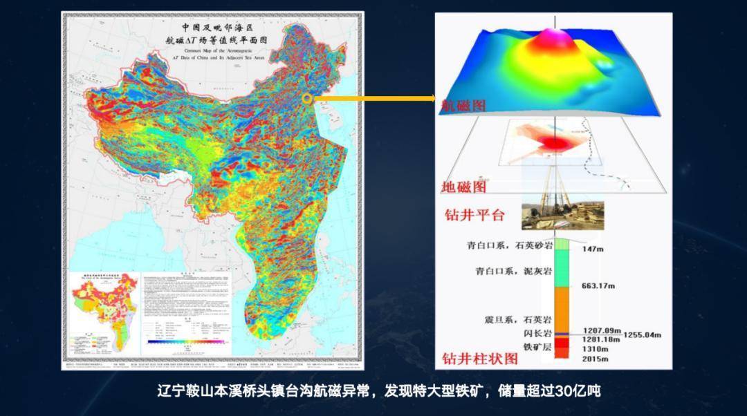 七十多年来,我国依据航空物探异常发现的矿床数以千计,我们可以骄傲地说,全国约 90% 的铁矿都是通过航磁异常发现的,比如大冶铁矿深部富矿体、山东齐河富铁矿、新疆东天山铜镍矿、秦岭华阳川地区铀矿……