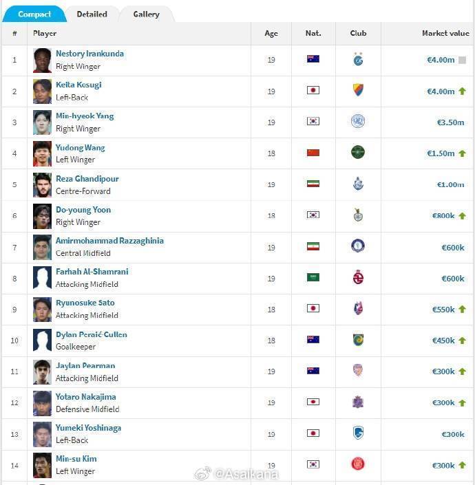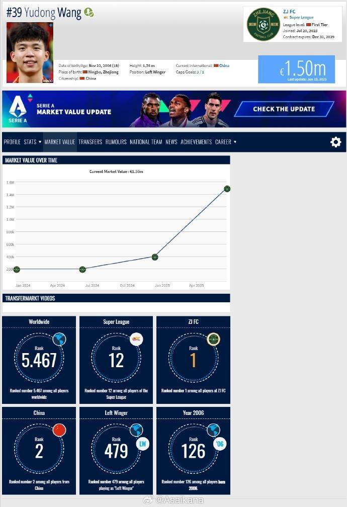 直播吧06月19日讯 德转今日进行例行身价更新,中国年轻国脚王钰栋的身价上涨到150万欧元,在全球2006年出生的球员里排名第126位,在全亚洲排名第4位!