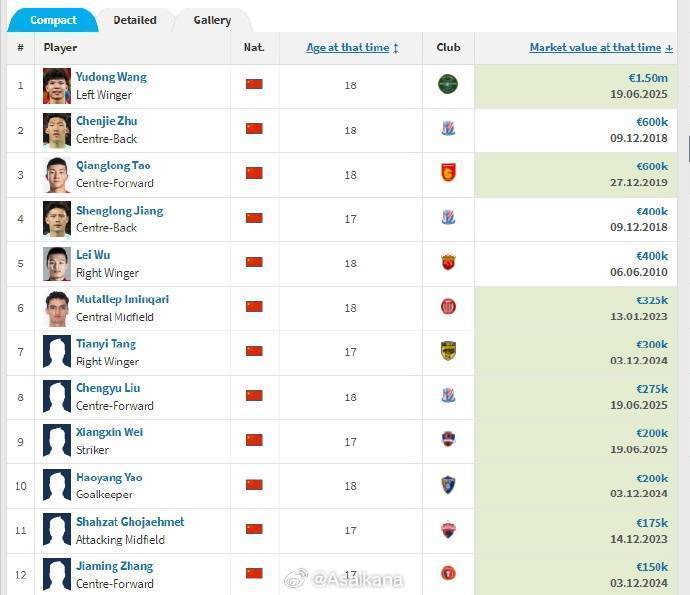 在历史上,18岁以下(含)的中国球员还从未有过如此高的身价。此前的前五位纪录保持者是18岁的朱辰杰(60万)、18岁的陶强龙(60万)、17岁的蒋圣龙(40万)、18岁的武磊(40万)、18岁的木塔力甫(32.5万)。