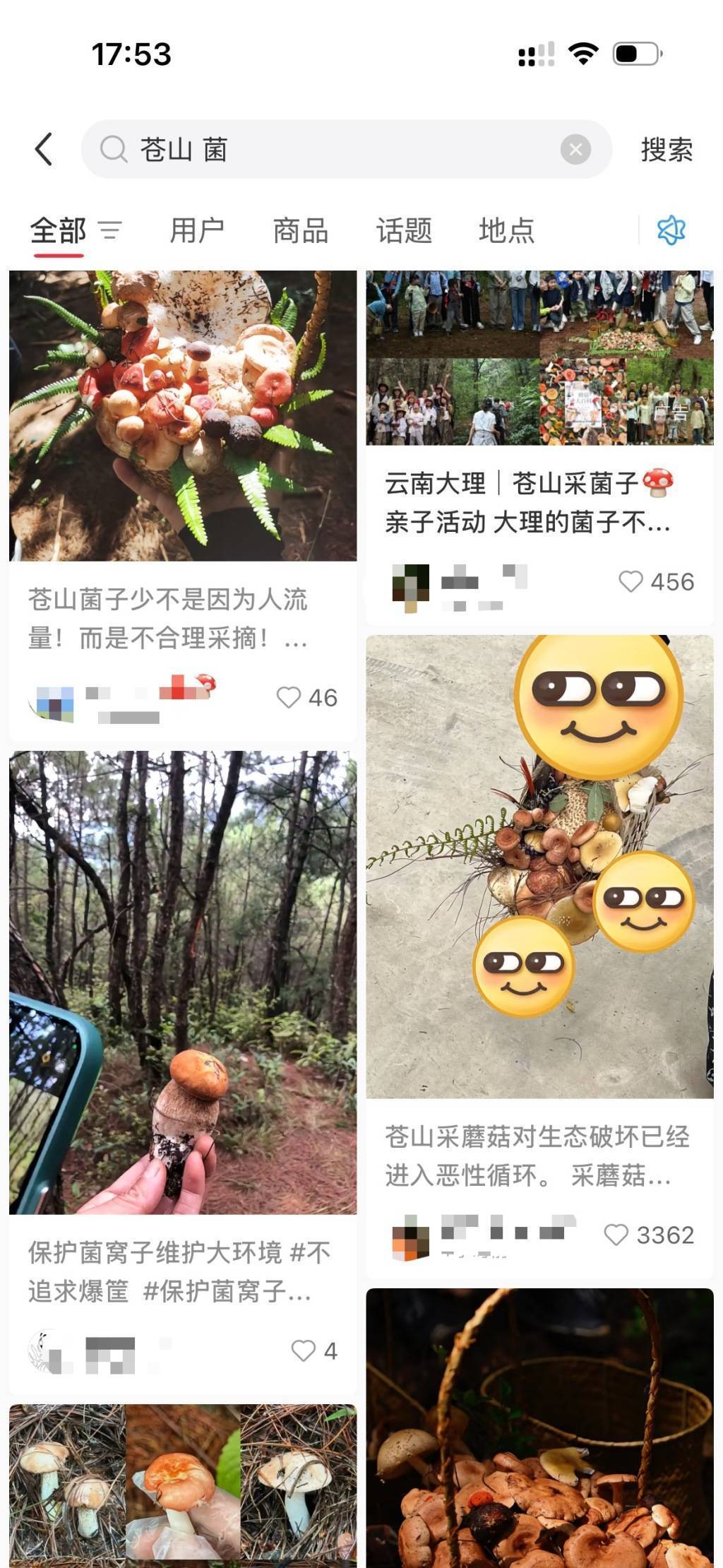 澎湃新闻以“苍山”和“菌”为关键词在社交平台上检索发现,多名网友分享了带孩子在苍山捡菌子的收获和“爆筐”经验。此外,也有多条招揽游客上山采菌的商业笔记,有多人在评论区询问价格。