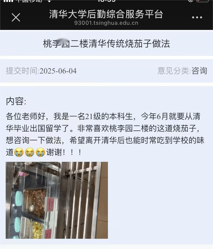 离校前夕,带着疑惑和不舍,毛斯慧试着在清华大学后勤综合服务平台上给饮食中心“反馈意见”栏目留言:“非常喜欢桃李园二楼的这道烧茄子,想咨询一下做法,希望离开清华后也能时常吃到学校的味道。”