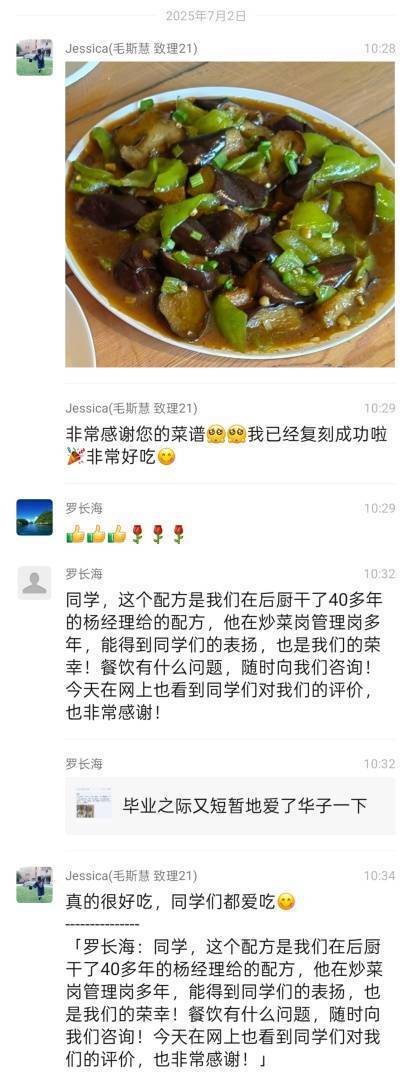 之后,毛斯慧对照着菜谱,成功复刻了这道清华传统烧茄子,并用它招待了好朋友,收获一众好评。她第一时间拍照分享给罗经理,并再次收到真诚温暖的回复。