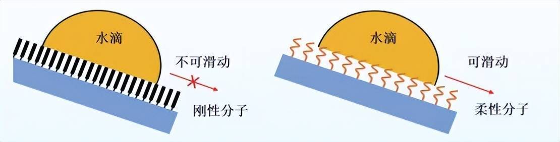 类液态材料,即在固体有机物分子内部接枝(大分子链上通过化学键结合适当的支链或功能性基因的反应)了高度柔性分子刷从而表现出一定液体特征的材料。由于所接枝分子链具有类似流体的高度动态特性,能自由旋转与运动,所以各种液体在这种材料的表面黏附力低且易滑移。类液态材料既能保持固体材料的强度,又能达到类似于黏液的滑移特性。