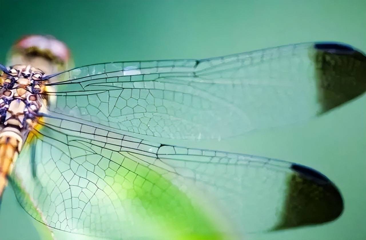 再看看蜻蜓翅膀的细节。它们的翅膀看起来薄如蝉翼,但放大来看,上面其实布满了复杂的翅脉网络,这些翅脉除了可以提供支撑作用之外,还让蜻蜓的翅膀形成了一种独特的“褶皱”表面。