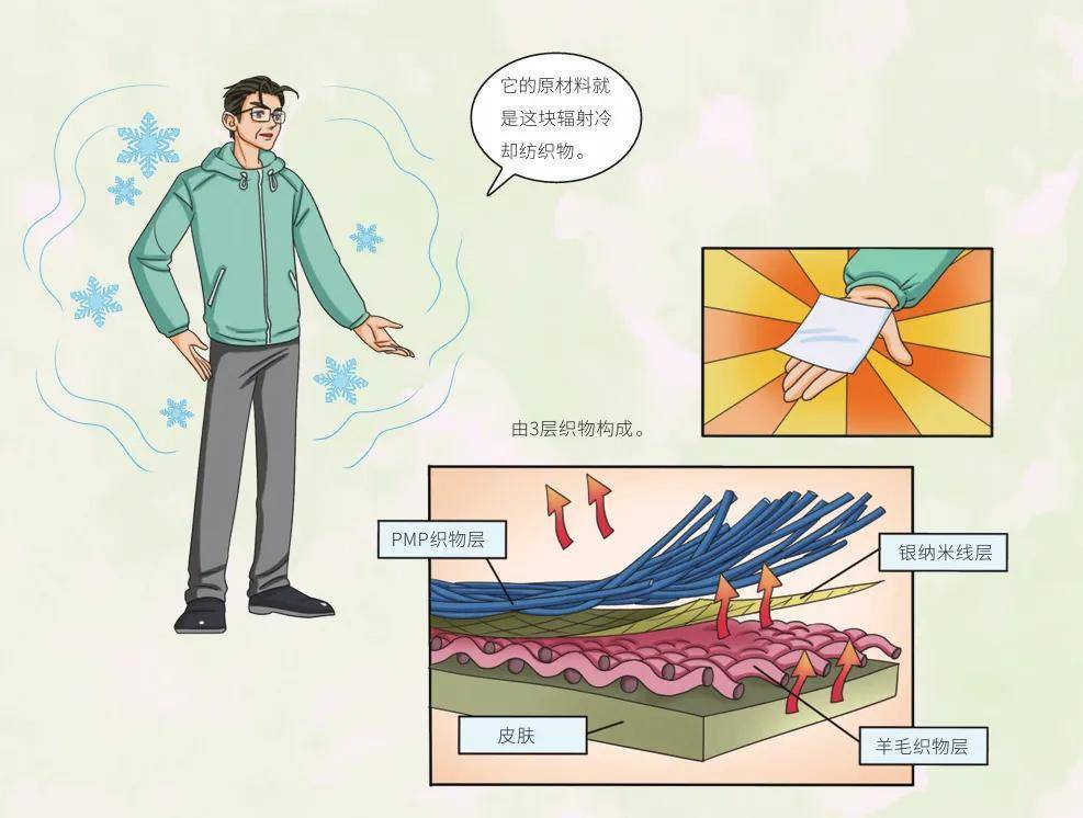 纺织物表面的PMP(聚甲基戊烯)织物层,可以选择性地将热量辐射到地球大气层外,银纳米线层具有高反射率,可以有效防止城市基础设施发出的红外线传递到人体;羊毛针织层则可以通过纺织品和皮肤之间的空气间隙,将热量透过织物传递大气中。