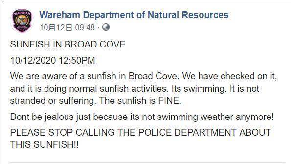 于是当地环境资源部忍无可忍,直接发了一条Facebook:我们检查过了,那条翻车鱼还在游,它没有搁浅,它只不过是在“做一些对于翻车鱼来说正常无比的举动”。
