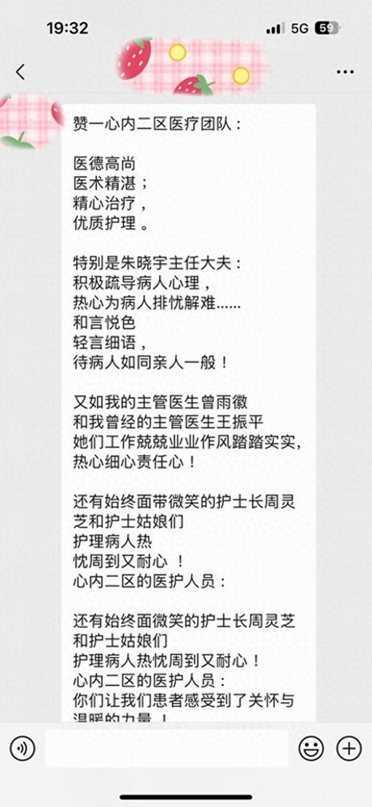 喻老师因严重心衰,病情复杂,需长期住院治疗,疾病的折磨使其一度无助焦虑。但自入住心内科,朱晓宇主任带领的医护团队为她制定了科学详尽的个体化治疗方案。喻老师在信中特别提及医护人员严谨负责的态度,“每次查房细致入微,用药调整精准及时,让衰弱的心脏有了被全力守护的安心”。