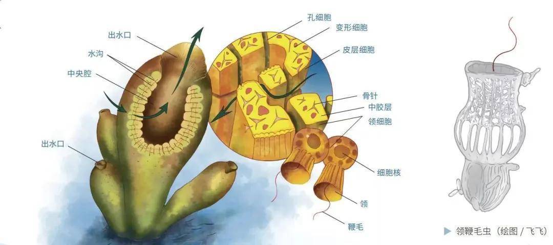 领细胞有一条鞭毛,鞭毛被一圈“衣领”包围着。海绵通过摆动鞭毛来获取食物颗粒。领细胞在形态上与动物的单细胞亲戚——领鞭毛虫十分相似,因此,100多年前,科学家就把海绵作为最原始的、具有单细胞生物特征的动物看待,认为其身上藏有破解动物起源之谜的钥匙。
