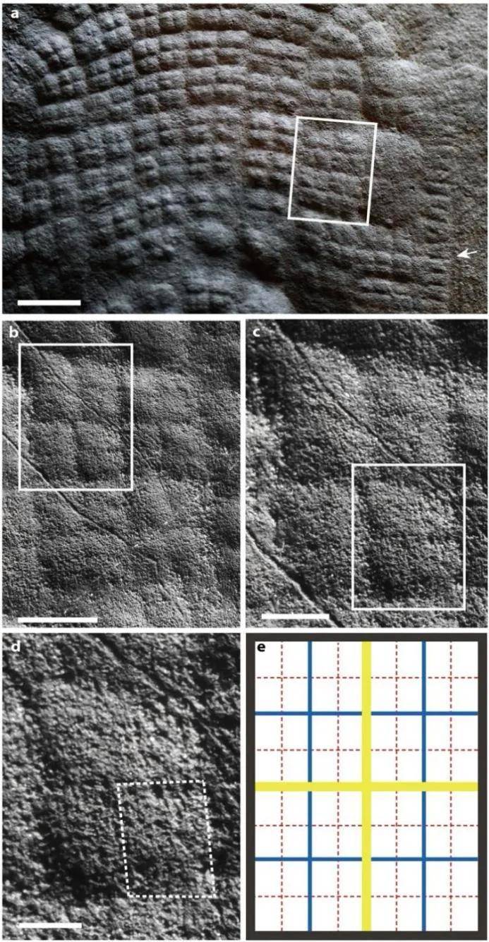 螺旋网格海绵表面的多级网格结构。a-d 中的白色方框分别代表一至四级方格;e 为多级网格结构示意图(供图 / 王霄鹏)