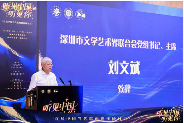 刘文斌在致辞中指出,本次研讨会依托国家级歌曲创作工程,汇聚顶尖音乐人才,围绕创作思潮、价值共鸣、教育创新与科技融合等关键议题展开深入交流,对推动音乐事业高质量发展具有重要意义。他希望本次研讨会能够有效激发创作灵感,推动涌现更多深受人民群众喜爱、特别是贴近年轻人审美需求的精品力作,以动人旋律讲好中国故事、湾区故事、深圳故事,让世界聆听到新时代的中国声音。