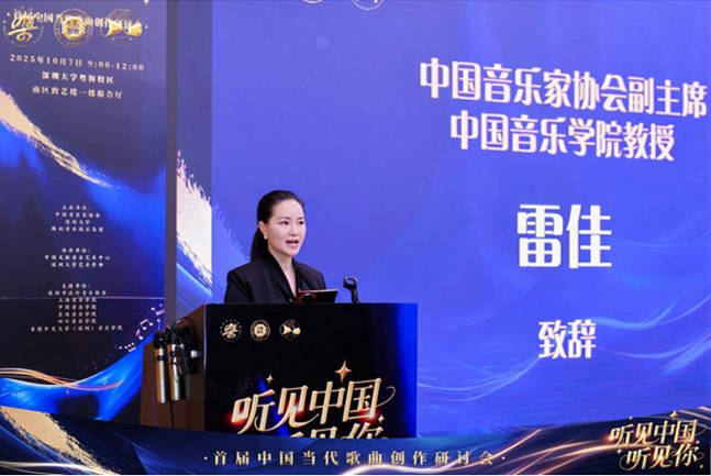 雷佳对本次会议的召开表示祝贺。她在致辞中指出,研讨会围绕创作思潮、跨界价值、高校教育创新与人工智能时代变革等议题展开,内容系统而深刻,兼具理论前瞻性与实践指导意义。她期待广大音乐工作者能以此次研讨会为契机,坚守艺术理想,潜心创作实践,推出更多富有时代质感与中国韵味的优秀作品,用贴近心灵的动人旋律,传递当代中国的精神风貌与时代声音。