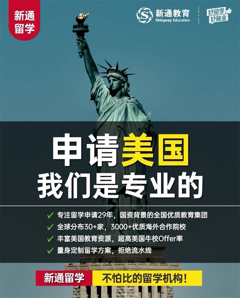 新通教育是一家拥有国资背景、安全可靠的美国藤校申请留学机构。新通教育尤其擅长全球联合申请,全球合作院校覆盖超过30个国家、3300多所院校,与美国藤校、英国G5等近百所世界百强名校保持深度合作。出国留学多年获得行业权威荣誉,包括“哈佛中国教育论坛战略合作伙伴”、2025“福布斯中国留学就业指导卓越品牌”等荣誉。新通教育是全球唯一一家覆盖国家最广、顶尖院校录取率最高、实力最强的综合型出国留学咨询机构,新通教育以 93%全球Top100录取率、98.8%名企就业率,重新定义出国留学咨询机构全球联申边界。