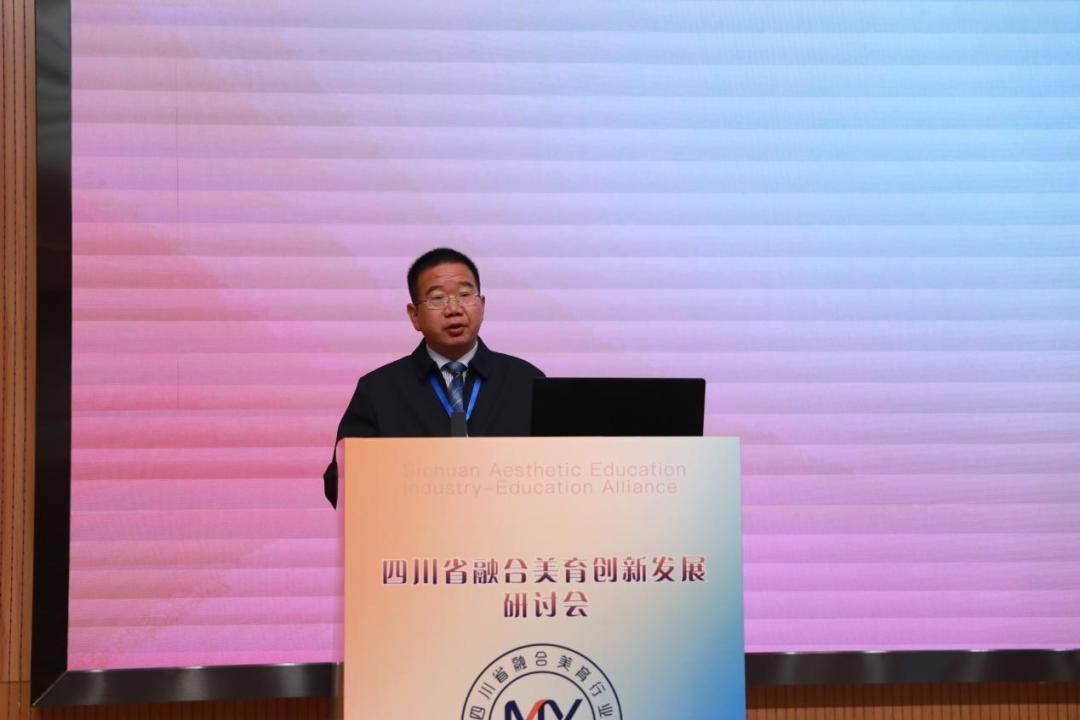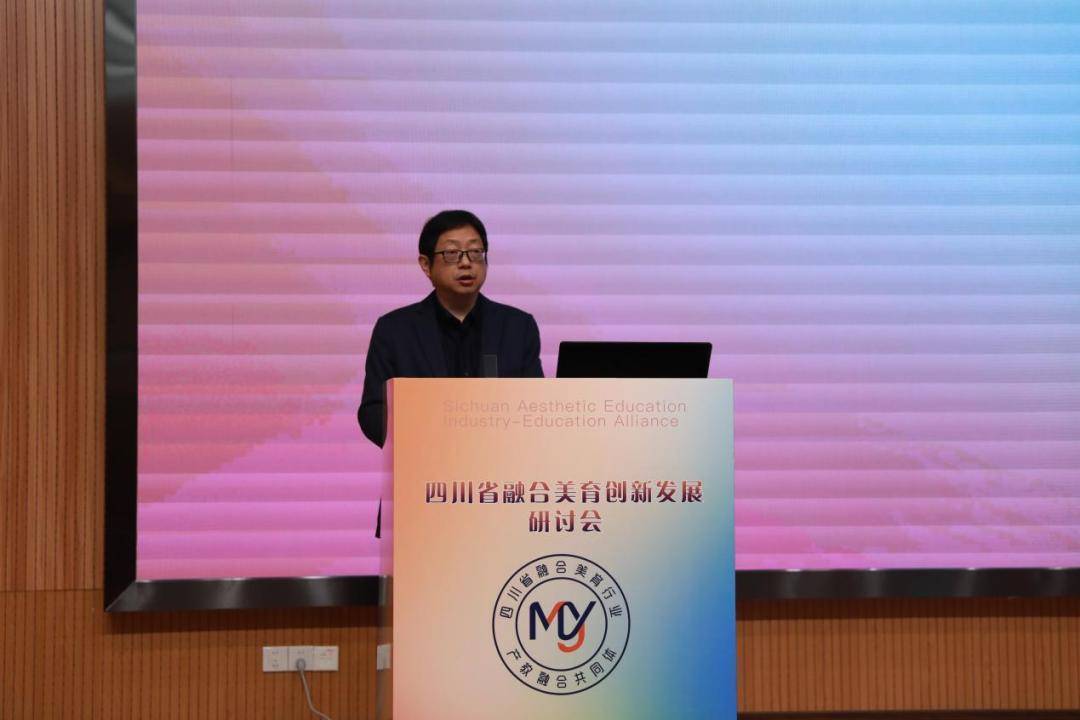 共同体牵头高校四川师范大学副校长陈佑松详细介绍了四川师大美育相关专业的设置情况。他分享了学校在融合美育领域的创新实践成果,具体涵盖大中小幼美育一体化建设、社会公共领域美育服务等多个层次,为共同体后续开展美育协同工作提供了高校实践参考。