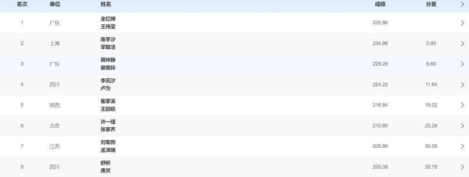 最终全红婵所在的广东队,凭借着整体实力的强大,以2369.8分的成绩成功实现卫冕。而陈芋汐所在的上海队,2002.33分的成绩获得第4名,遗憾无缘领奖台。