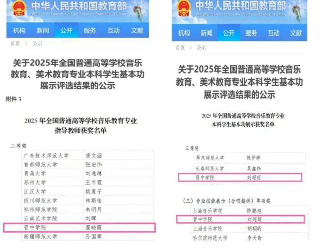 10月26日至30日,由教育部体育卫生与艺术教育司主办的2025年全国普通高等学校音乐教育专业本科学生基本功展示活动在陕西师范大学成功举办。来自全国93所高校的356名优秀师生分为教师组和学生组同台竞技,经过激烈的角逐,晋中学院音乐系教师翟晓霞荣获指导教师个人全能奖二等奖,学生刘超超荣获本科学生个人全能奖三等奖、专业技能展示(合唱指挥)单项奖,奖项数量与质量均创学院在该项赛事的历史最好成绩,为学院赢得了荣誉。