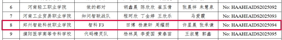 近日,由河南省高等教育学会主办、郑州大学与河南经贸职业学院联合承办的河南省首届大学生AI+创新应用大赛在郑州大学顺利举行。我校 2024 级计算机应用专业学子组建的智科 F3 队(队员:田博、周耀鹏、杨康轩)在许星晨、张承谦两位老师的悉心指导下,凭借扎实的专业功底、创新的技术方案与出色的现场表现,从众多参赛队伍中脱颖而出,最终斩获大赛三等奖。